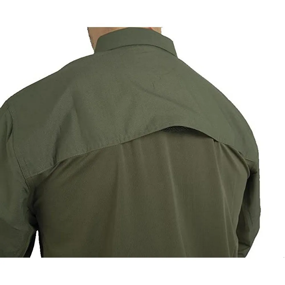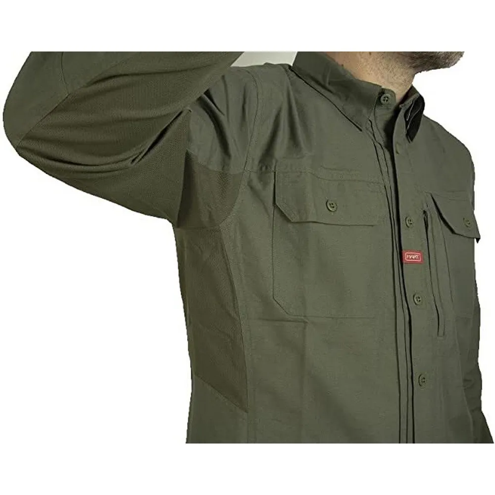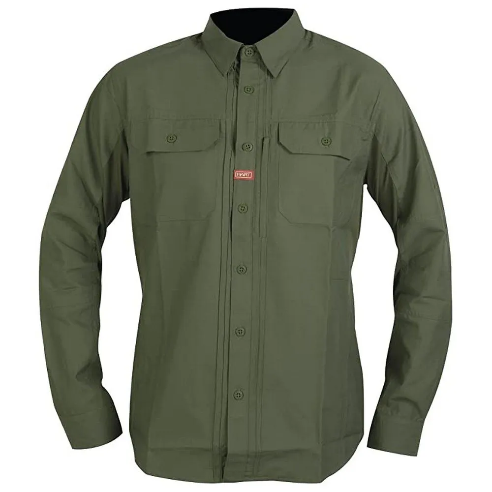 Hunting and outdoor shirt for mild and hot weather conditions. Ventilation opening of backside. Mesh pieces on arms, underarms and backside for improved ventilation. Three pockets on chest: Two buttoned and one zippered. Hidden glasses cleaner under front placket. Strap for adjusting sleeves´ length. Fabric weight: 150gsm.