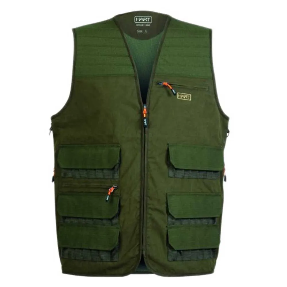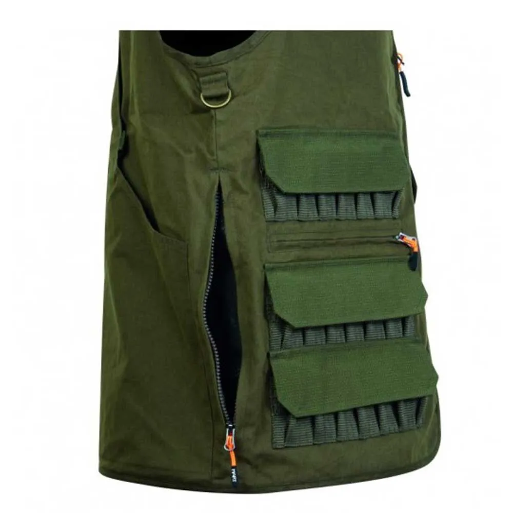 Hunting vest with upgraded cartridge containers´ capacity. Double game-pouch. Durable cotton blend fabric construction with rip stop reinforcements. Breathable mesh lining. Multiple cartridge loop lines. 2 zippered pockets outside and 1 pocket inside for documenmts.