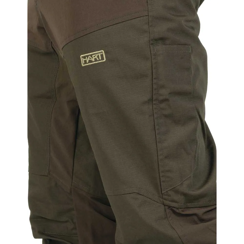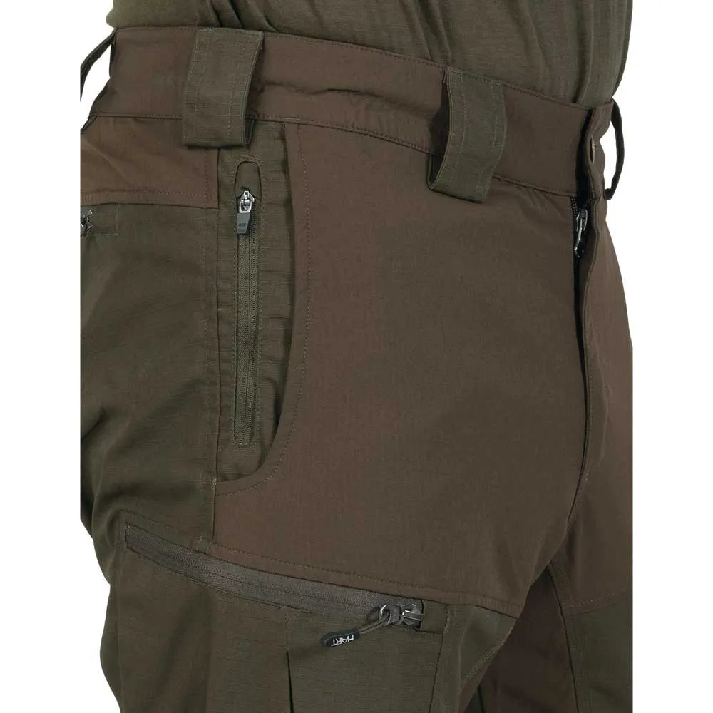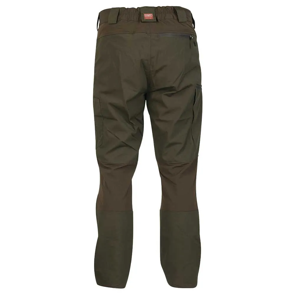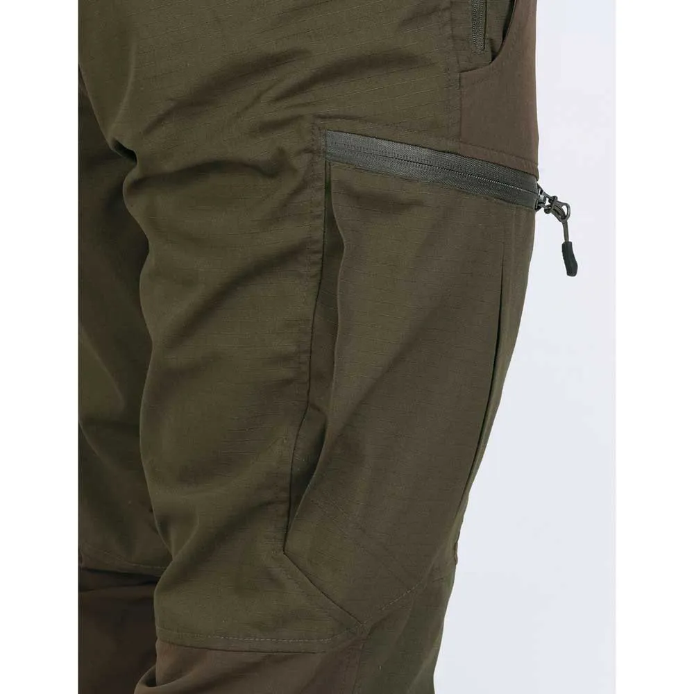 Cotton composition, rip-stop structure and water-repellent main fabric. 6-pocket construction: 2 upper pockets, zippered small pocket, zippered cargo pocket, knife pocket and backside zippered pocket.