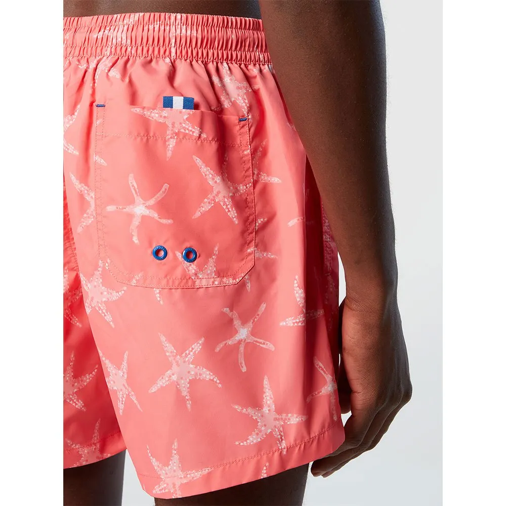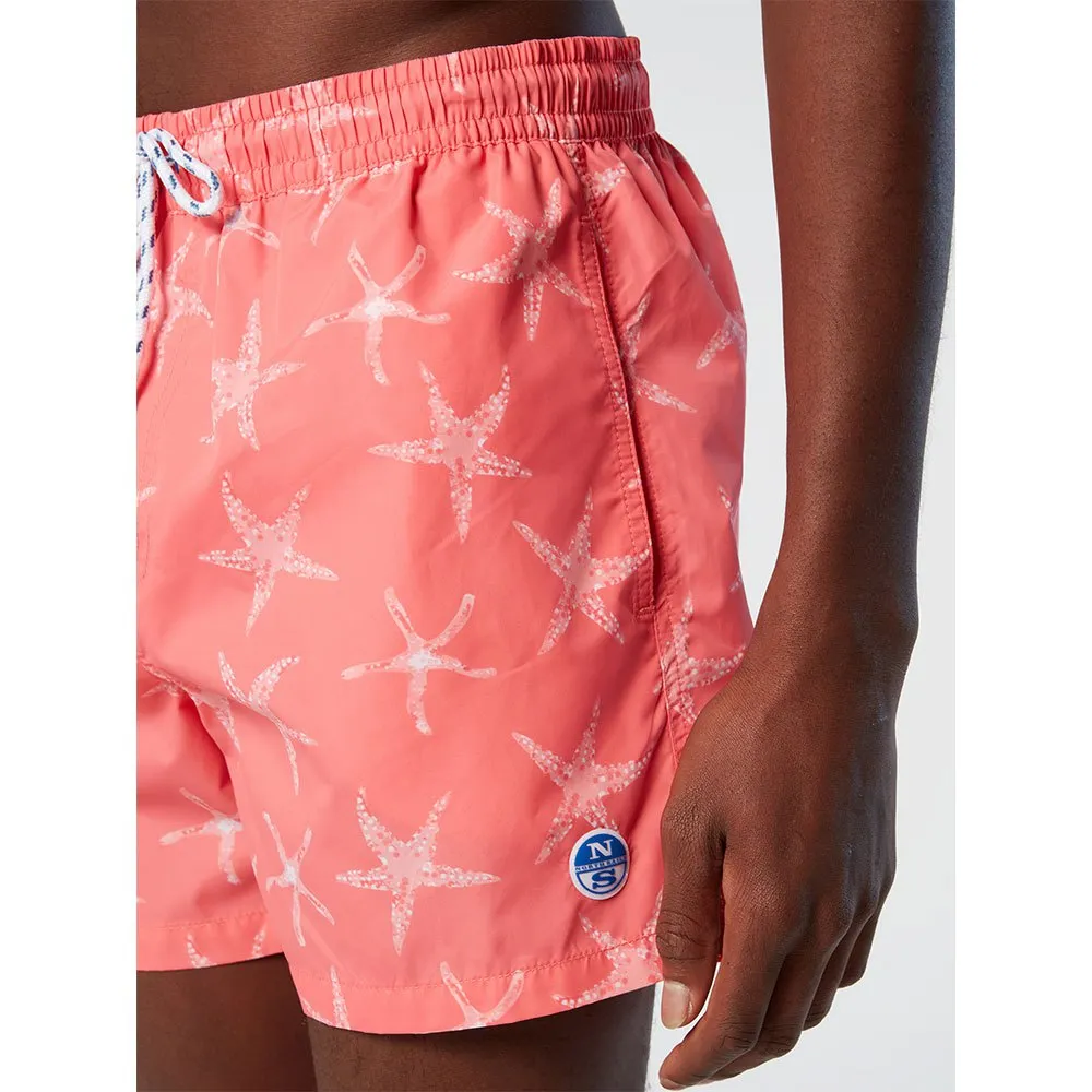 Swim shorts with seasonal all over print, royal/white logo patch, contrast drawstring, solid color inside waistband, and inner brief in mesh.