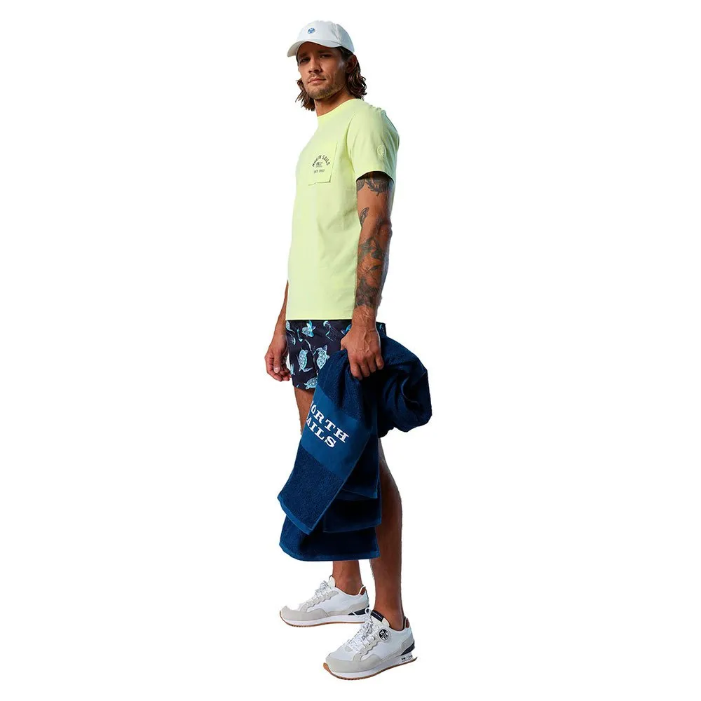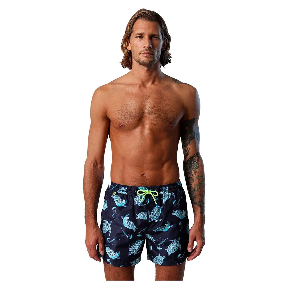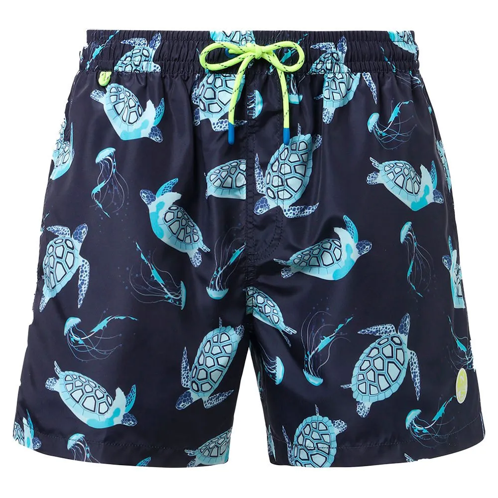 Swim shorts with all over prints inspired by the sea and water animals. Neon colored patch and drawstring. solid color inside waistband and inner brief in mesh.