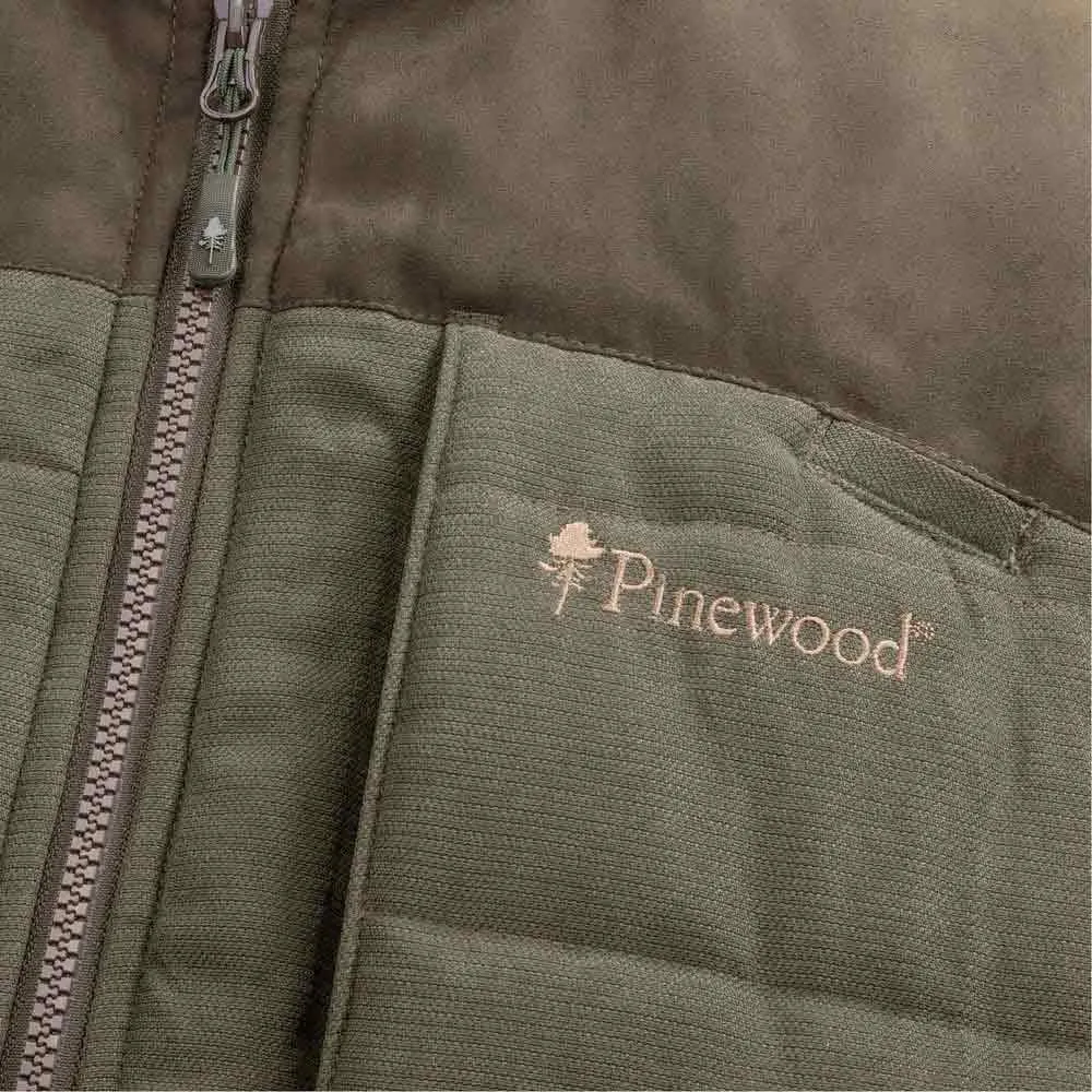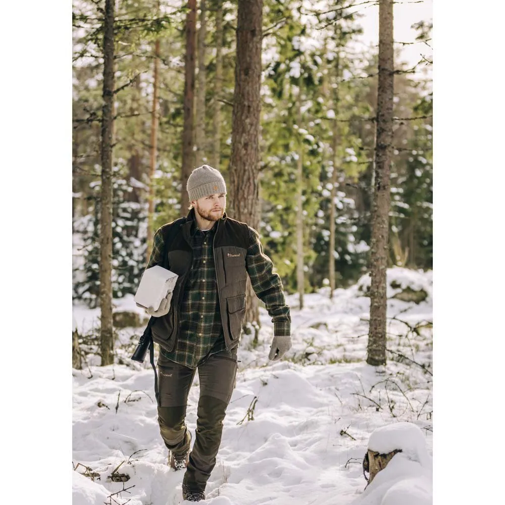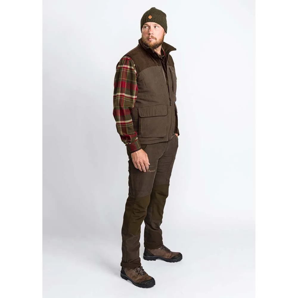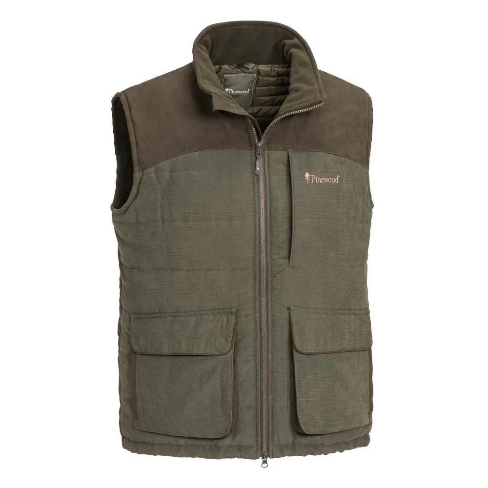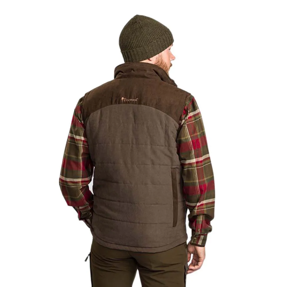 Windproof vest in soft and silent material. Padded for extra heat. Modern fit. The vest has a fleece lined collar. Spacious front pockets with silent magnetic buttons. Two-way zipper. Hand pockets, radio pocket, two inner pockets and large back pocket. Details in synthetic suede leather.